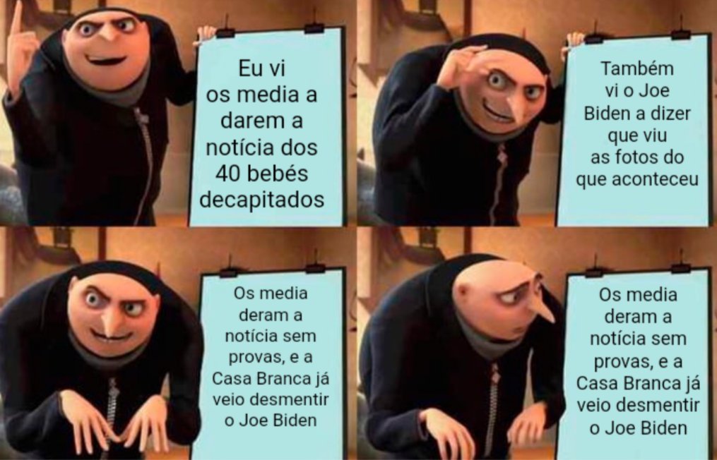O Hamas decapitou 40 bebés. Não. Degolou 40 bebés. Não. Não eram bebés. Eram sim, porque disseram no telejornal. Não. Foram mortos mas não foram decapitados nem degolados. O Hamas matou 40 bebés. Não. Não foram decapitados nem degolados nem mortos. Foram violados. O Hamas violou 40 bebés. Não eram bebés. Eram sim, o Biden diz que viu em directo na CNN. Não, não eram bebés. Eram sim, o Netanyahu confirmou. Não: